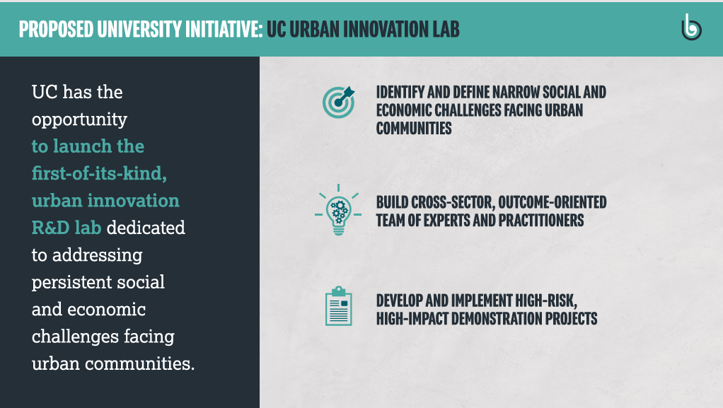 We shared with UC leadership our vision of a future of higher education that is oriented around a given problem, where research is focused on generating new, breakthrough innovations to critical challenges. Lorem ipsum dolor sit amet, consectetur adipiscing elit, sed do eiusmod tempor incididunt ut labore et dolore magna aliqua. Ut enim ad minim veniam, quis nostrud exercitation ullamco laboris nisi ut aliquip ex ea commodo consequat.